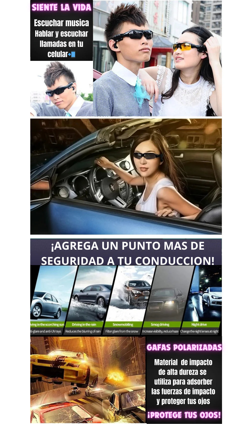 😎Haz de nuestras Gafas de Sol Inteligentes, tu compañero de confianza para tus aventuras en carretera. ¡Libérate de los cables y protege tus ojos mientras disfrutas de la vida con estilo! 🚗🏍️🎶