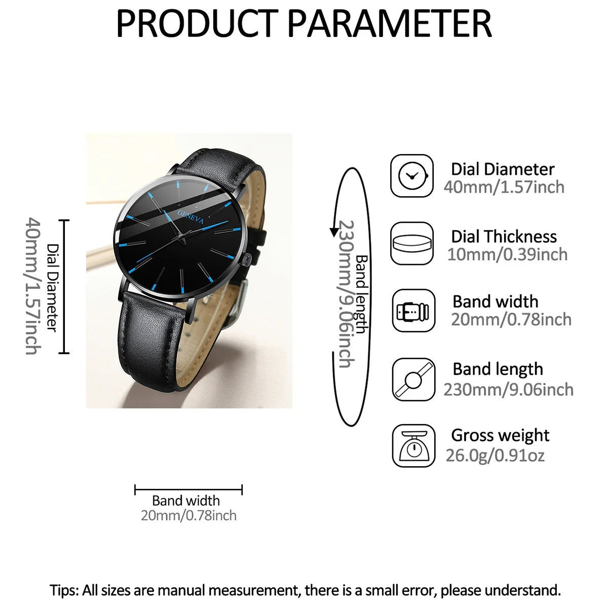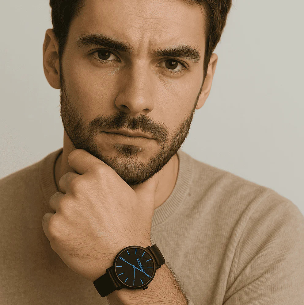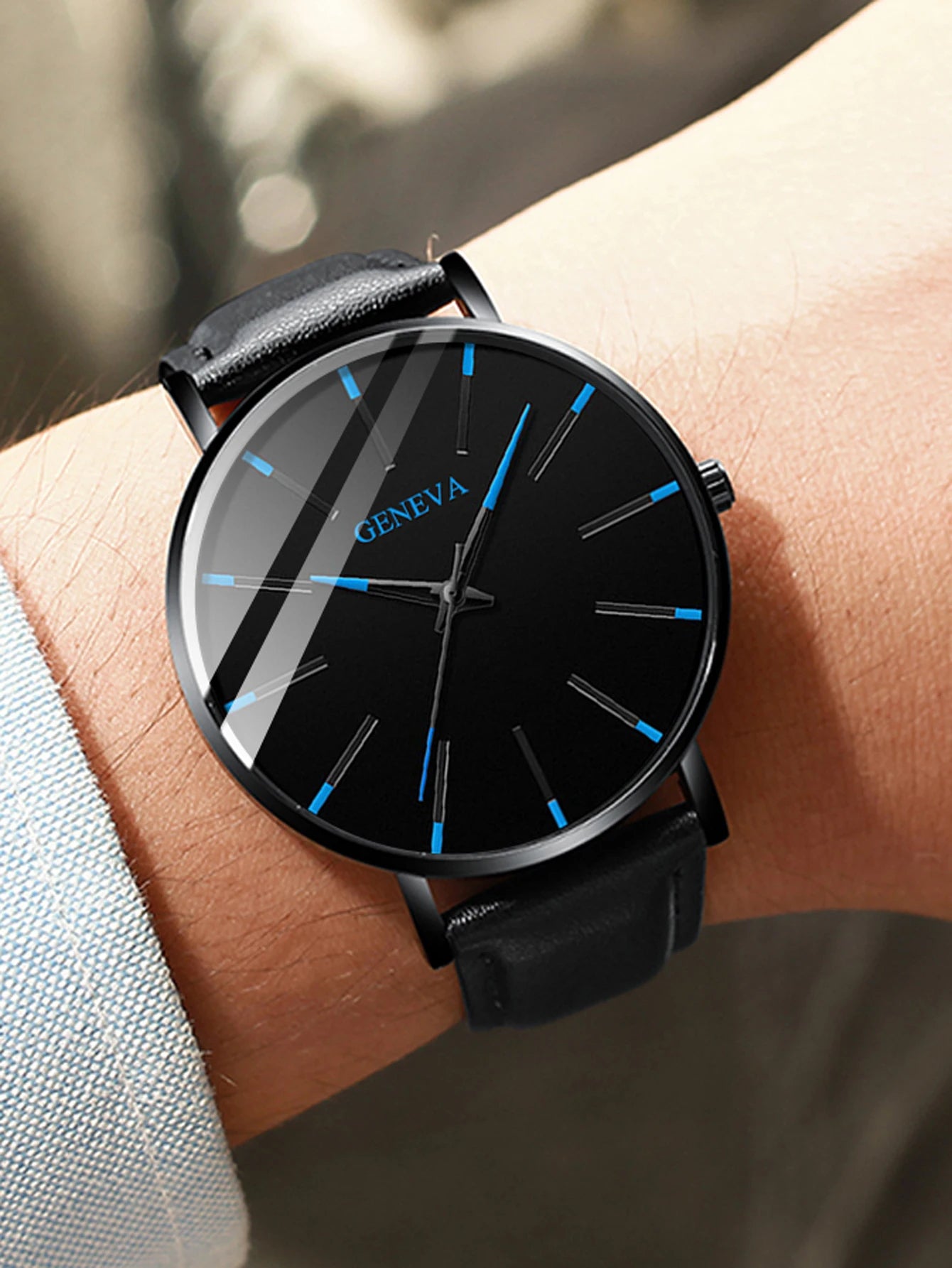 El Reloj Geneva Elegance ofrece un diseño minimalista y moderno con detalles en azul y correa de cuero. Elegante, ligero y versátil, es ideal para el día a día o cualquier ocasión especial.