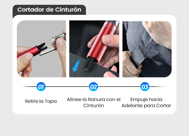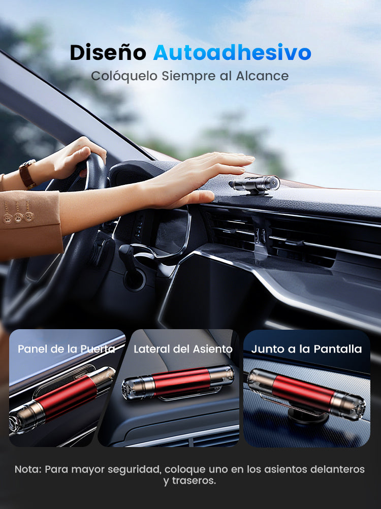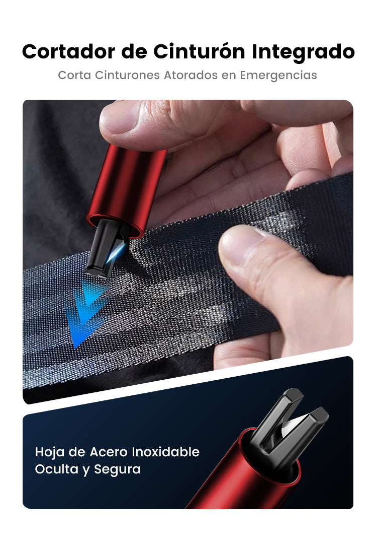 ✂️ Cuchilla en forma de U oculta – Corta cinturones de seguridad de inmediato y sin riesgo para tus dedos.